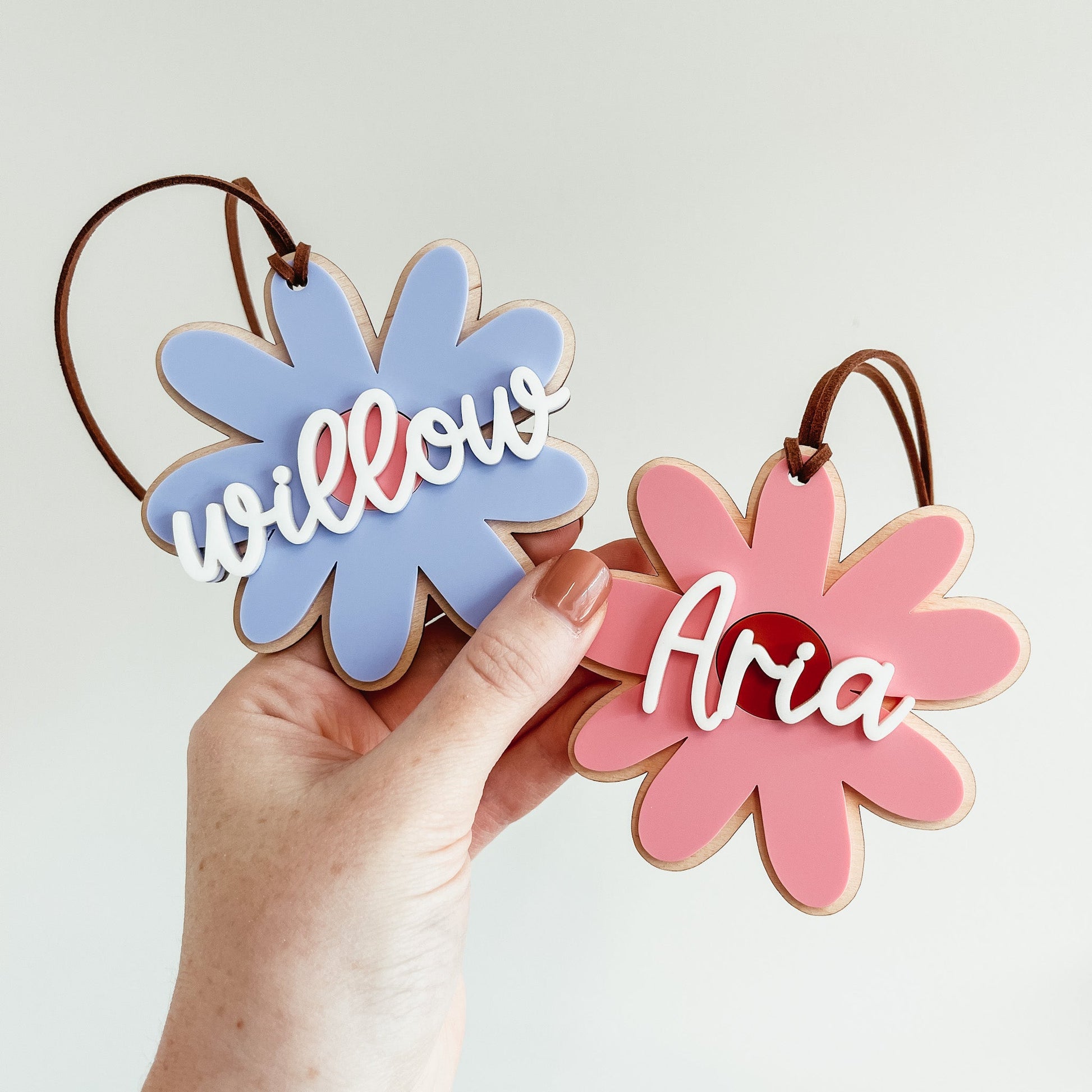 Each easter tag is constructed from three laser-cut layers of wood and acrylic. The background of the tag is high-quality birch wood; the flower pieces and name are cut from coloured acrylic and permanently adhered for a 3D effect. Finally the tag is finished a string for hanging.