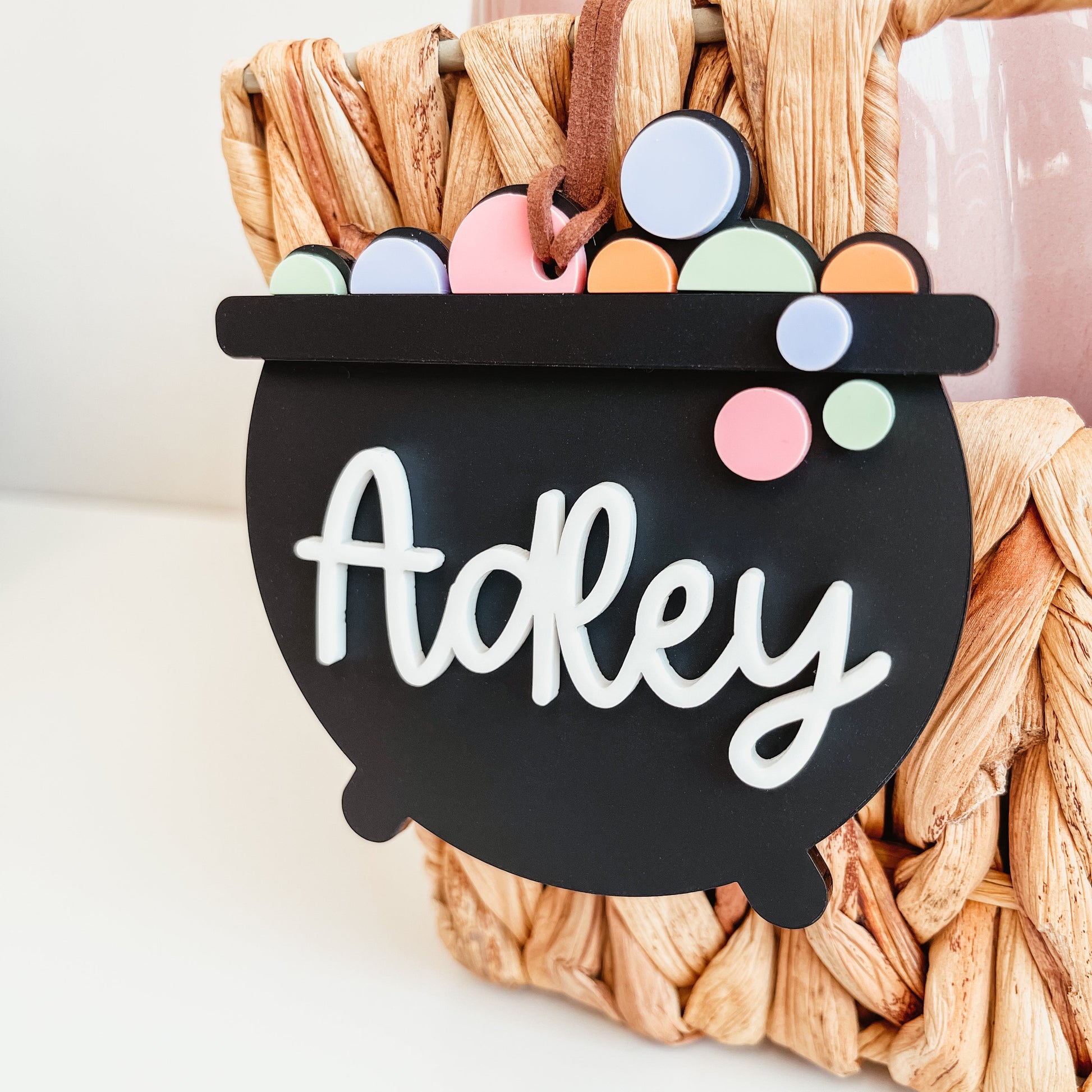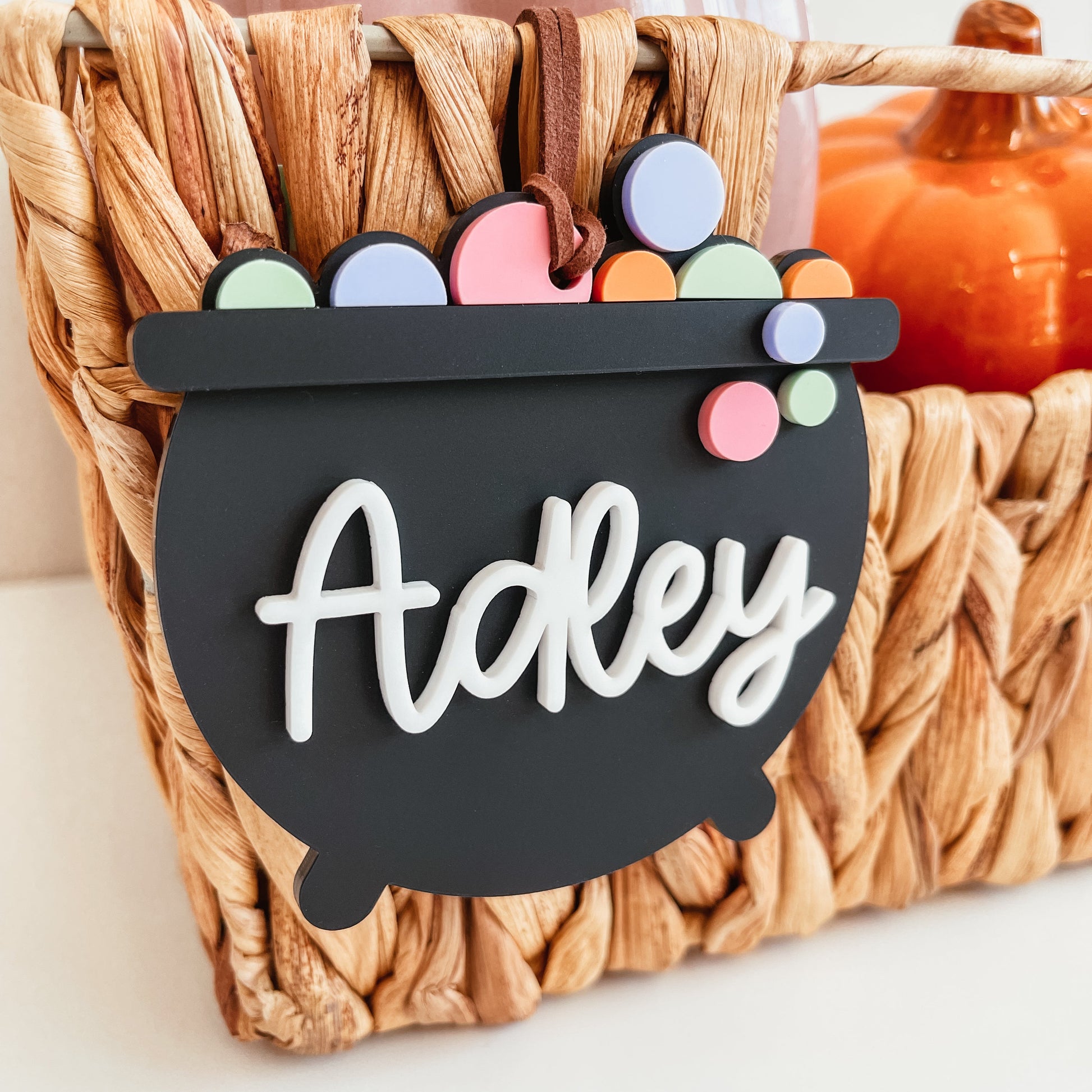 This acrylic bubbling cauldron tag is perfect for a boo basket or to add to a halloween gift basket!
