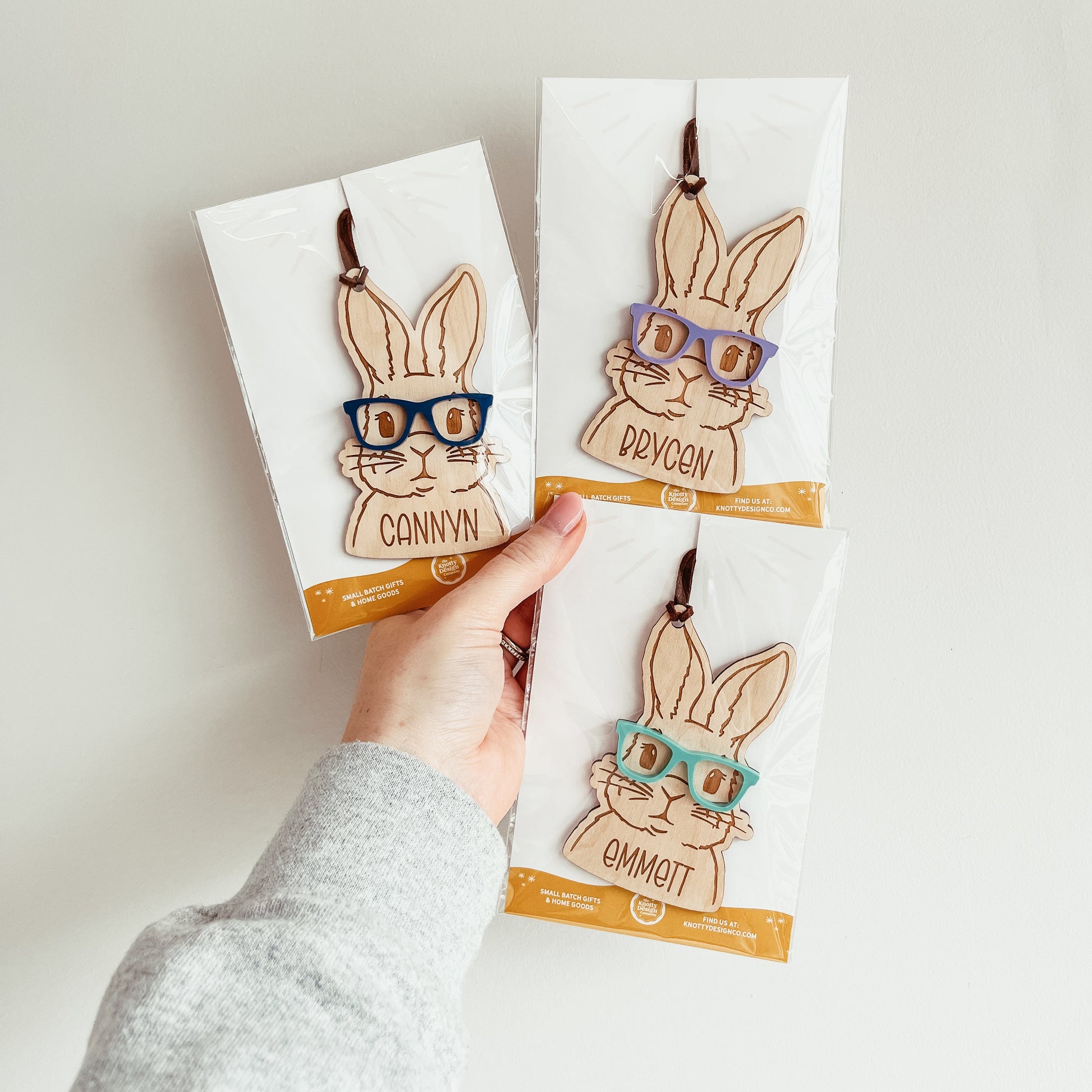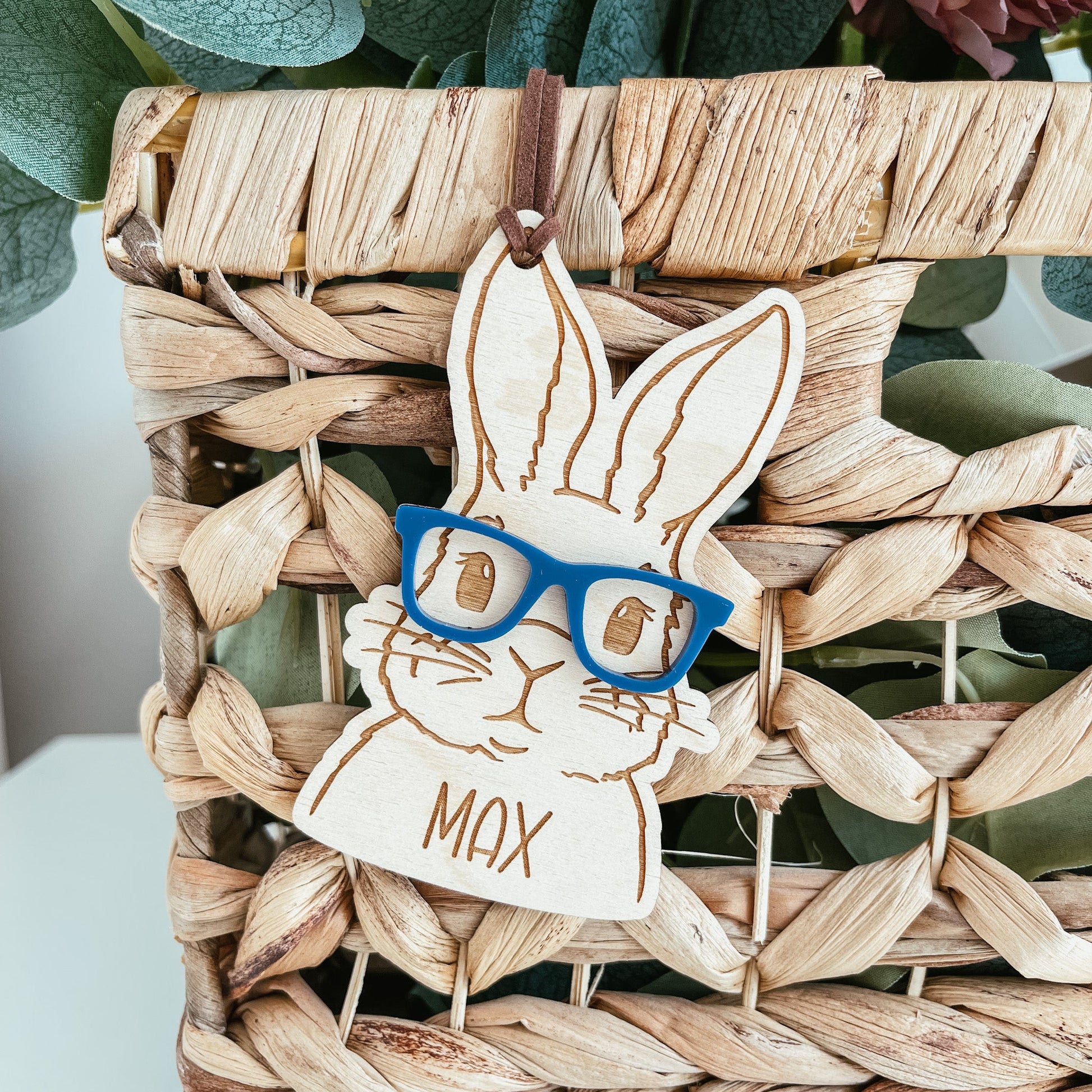 Each tag is cut from 1/8 inch high-quality baltic birch and features a 3D glasses. The bunny and name are engraved into the wood.