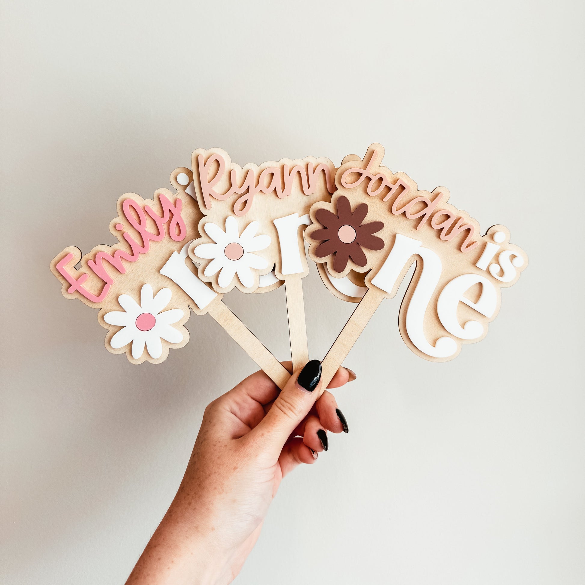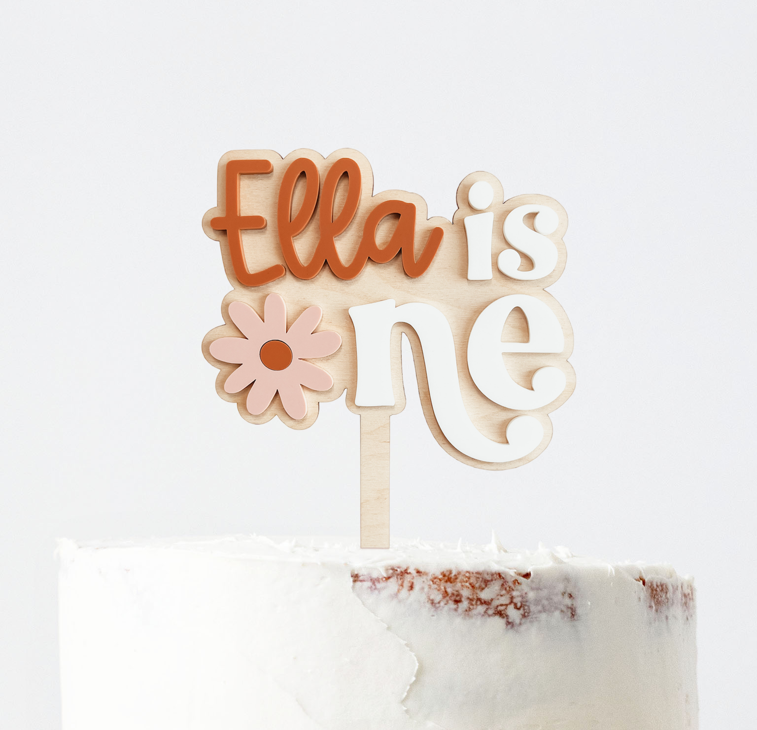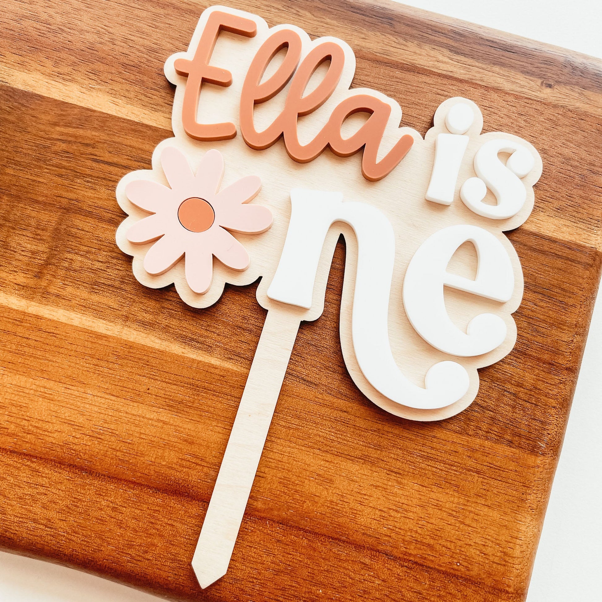 Each topper is constructed from two layers of wood and acrylic. The background is high-quality birch wood; the flower pieces and text are cut from coloured acrylic and permanently adhered for a 3D effect.
