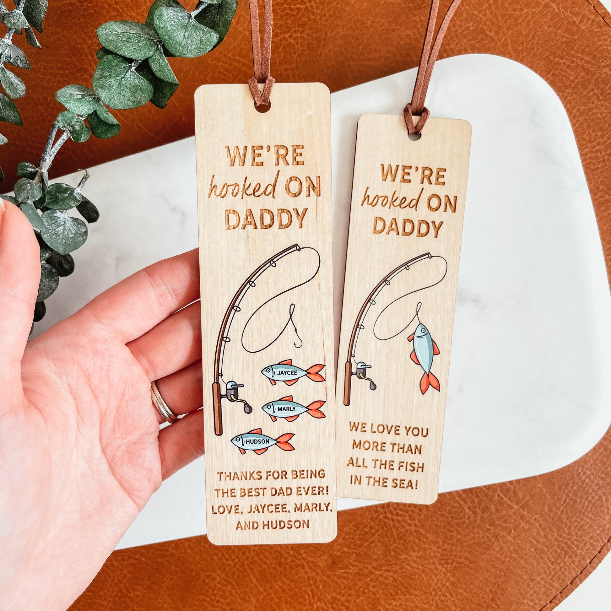 Please enter the details for your bookmark in the text box if you are ordering the personalized design. The name at the top, message, and names can be personalized. This style will fit up to five names/fish.