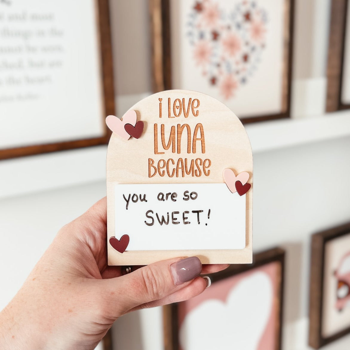 Leave cute little love notes on your fridge with this adorable personalized magnet! The message space works with any dry-erase marker (marker not included).