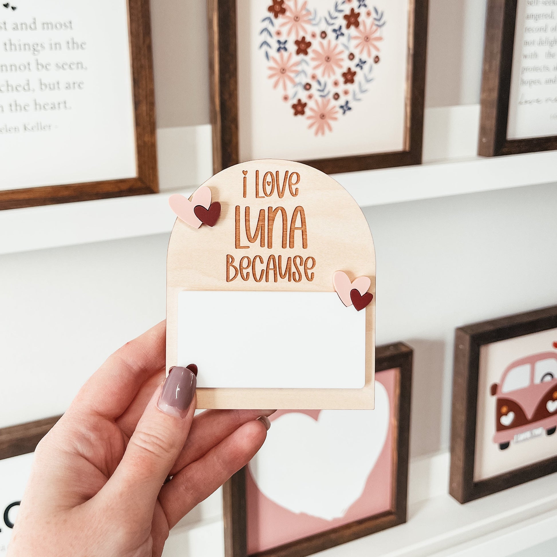 Each love message magnet is laser cut from 1/4 inch thick natural maple and engraved. Customize your magnet by adding a name and choosing the colour of your hearts.