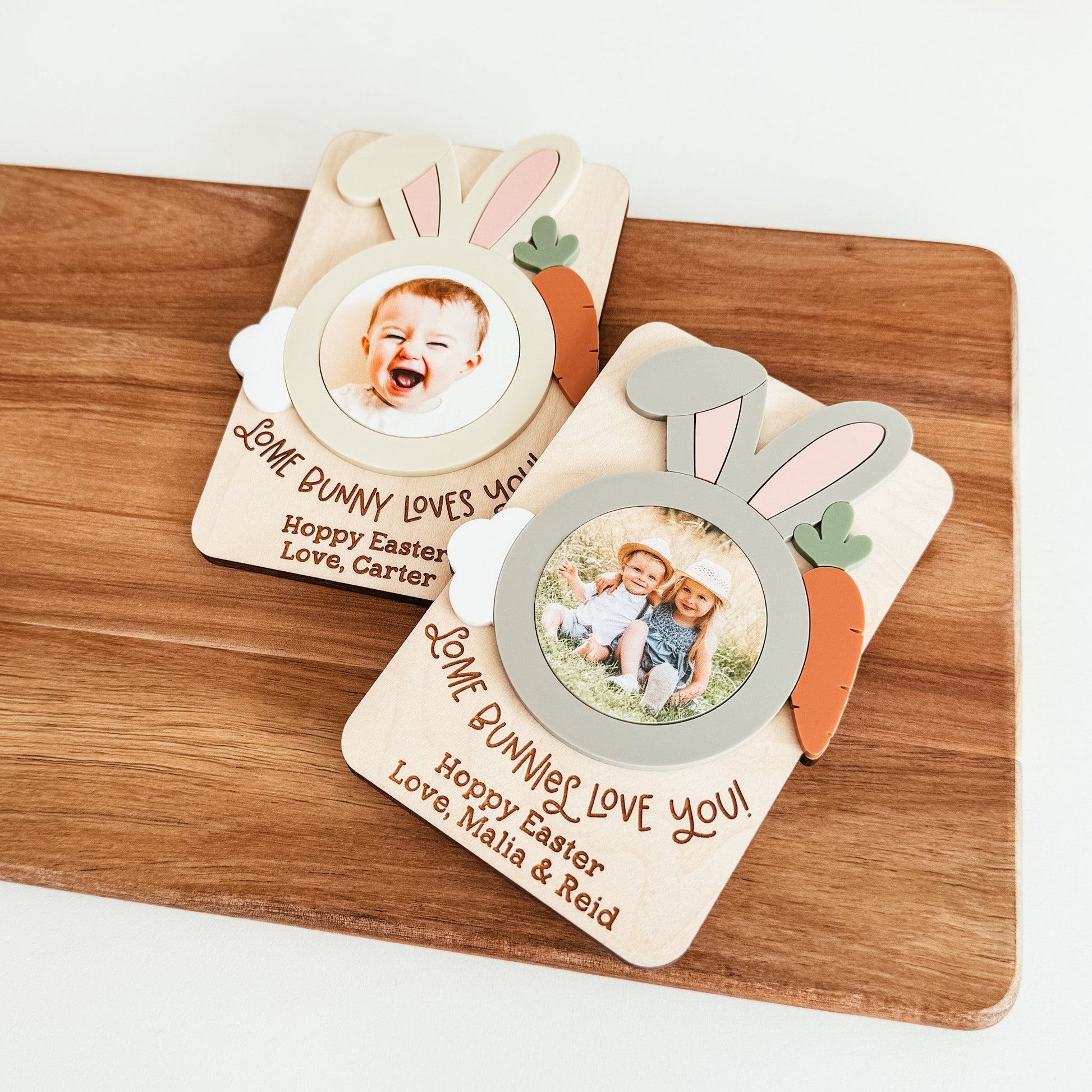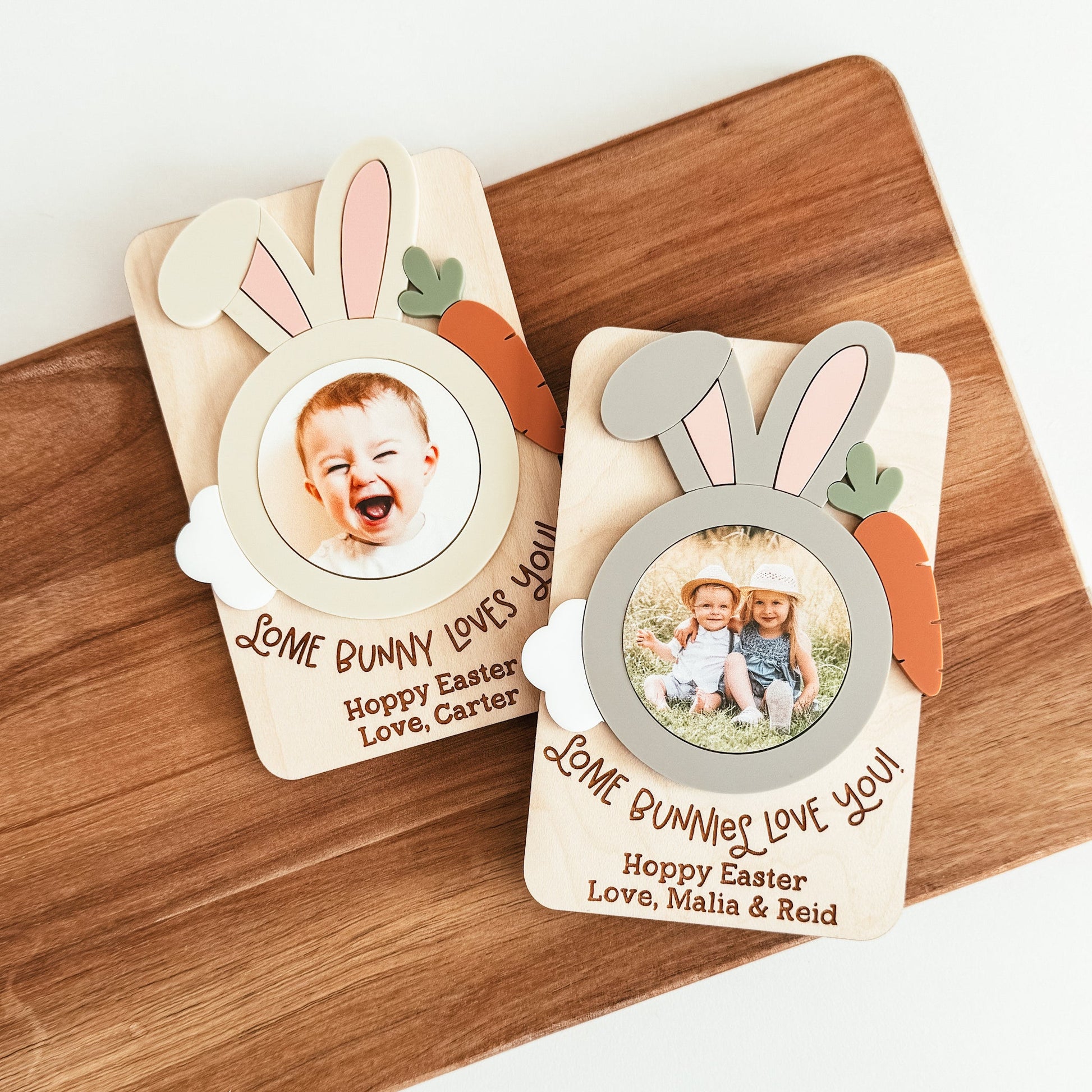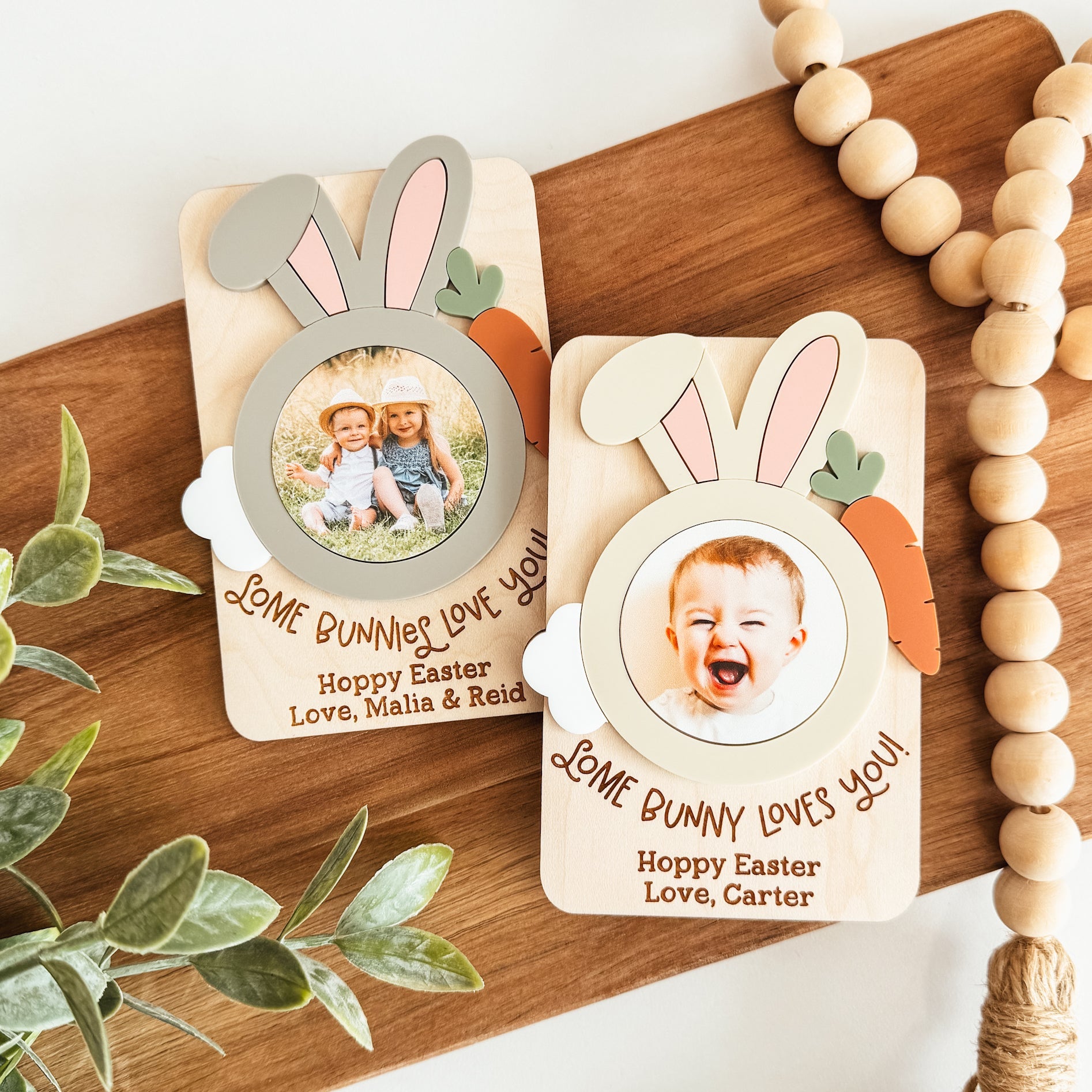 Each magnet is cut from 1/4 inch thick maple wood and engraved. The photo is printed with ink and the bunny and carrot pieces are 3D.