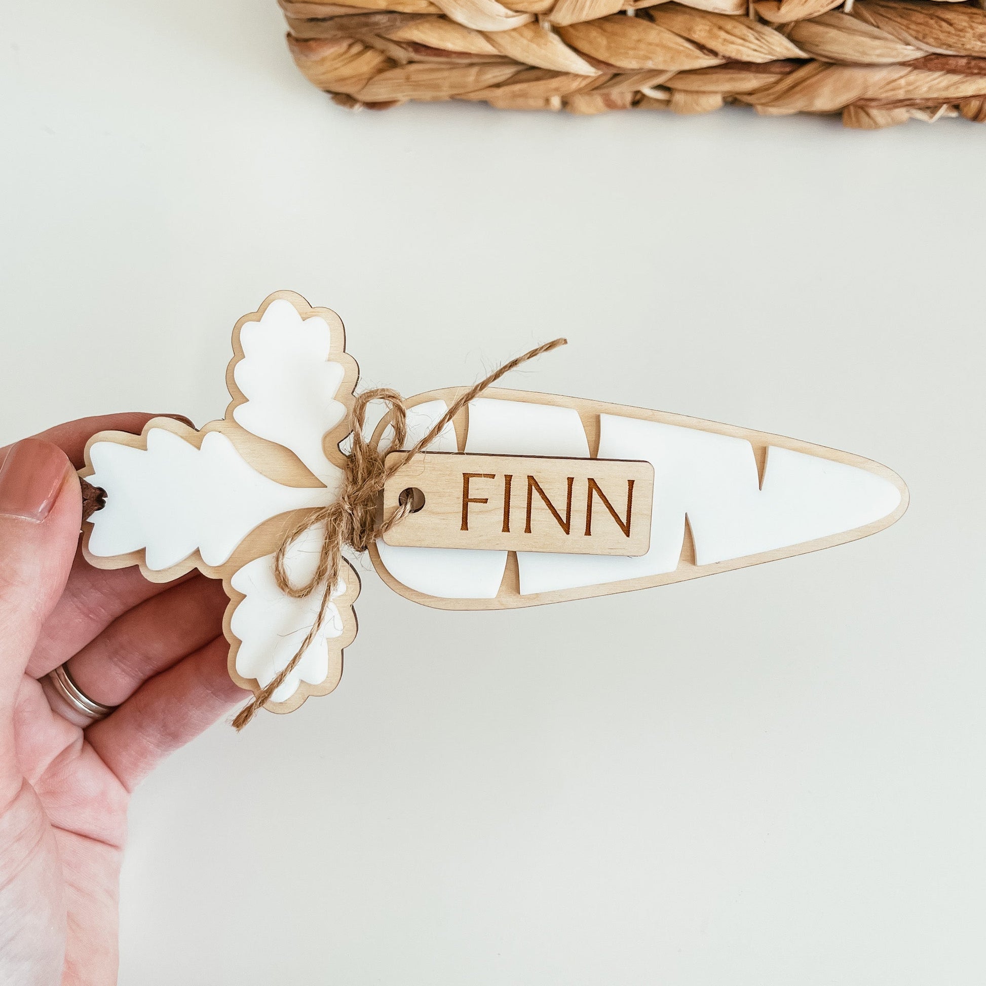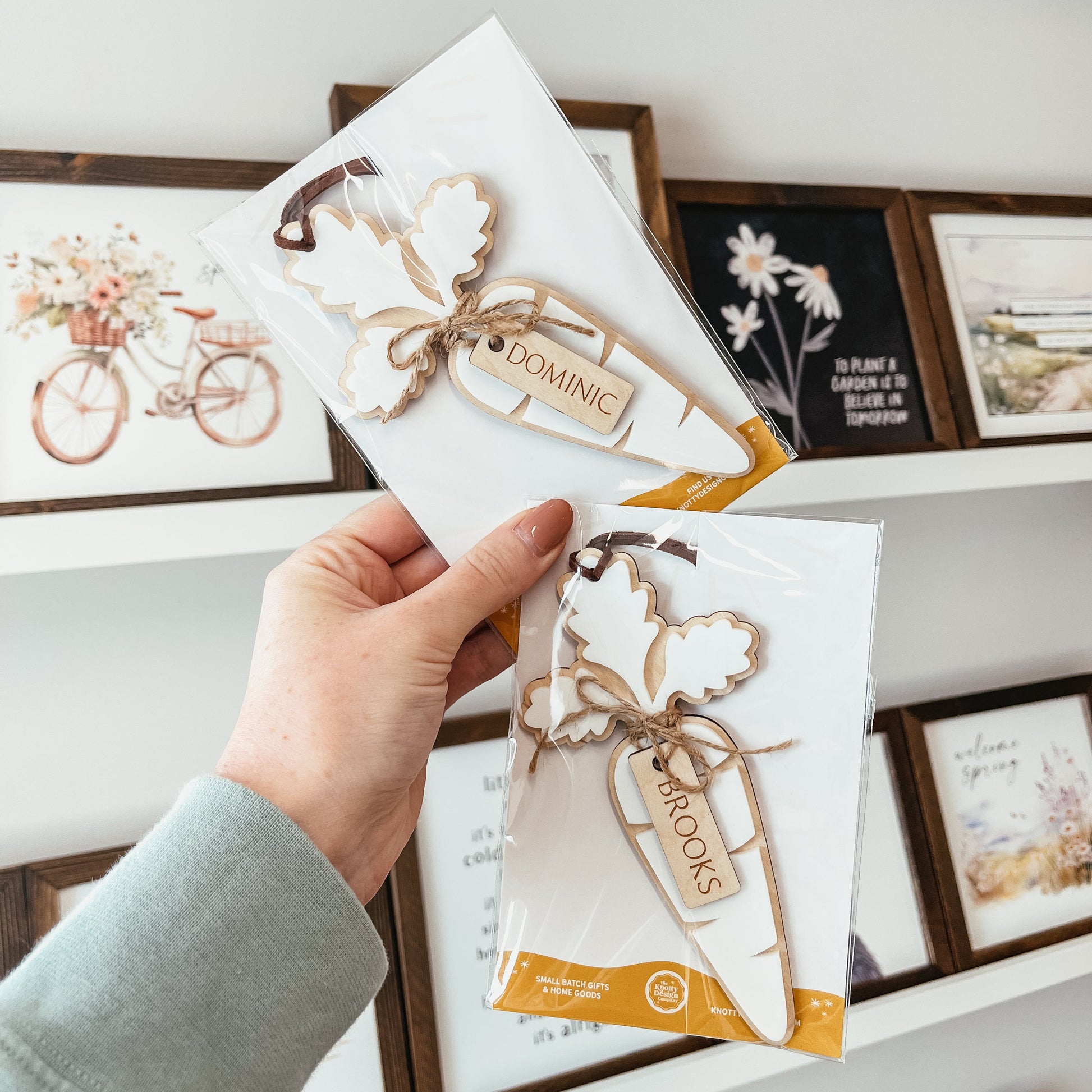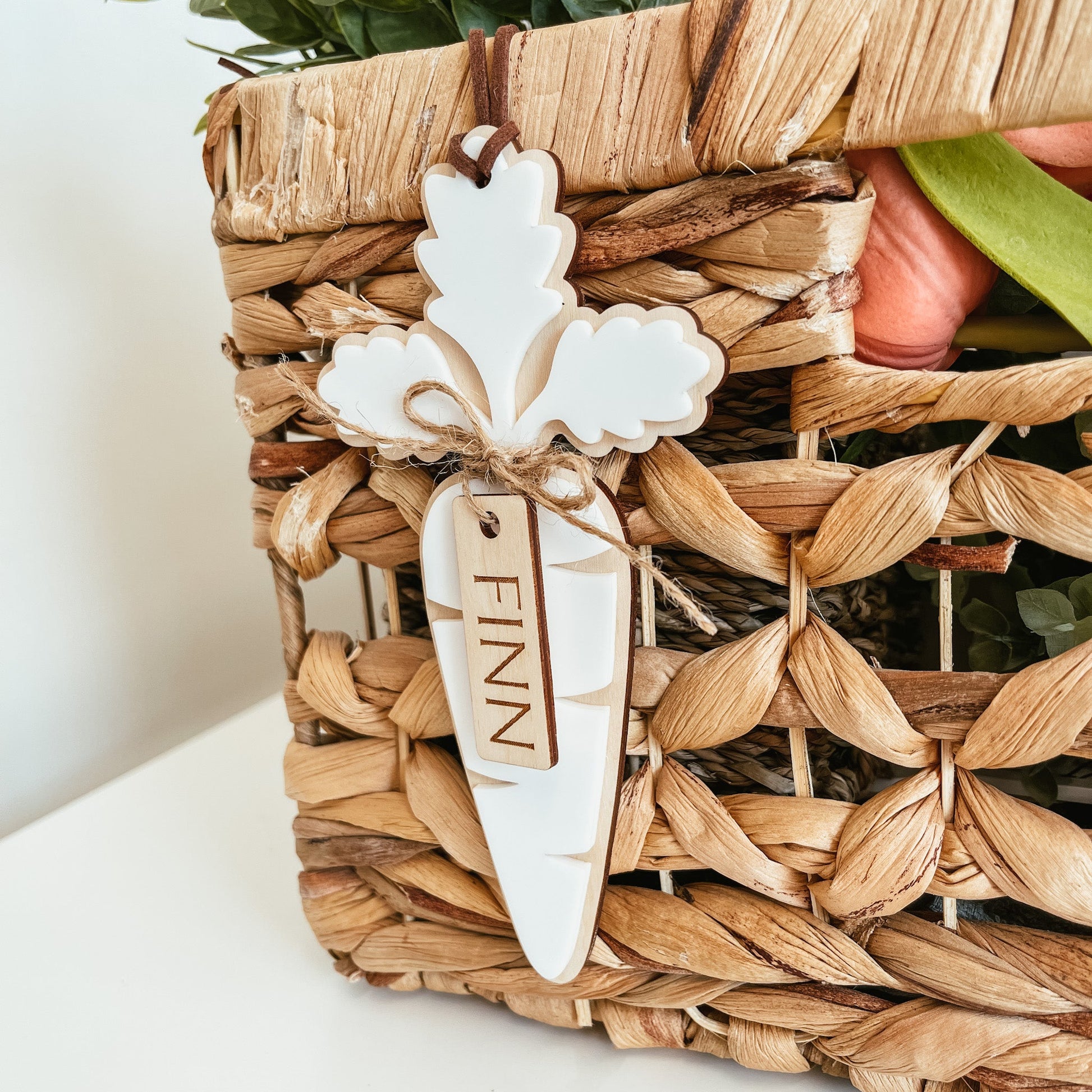 Each easter tag is constructed from two laser-cut layers of wood and acrylic. The background of the tag is high-quality birch wood; the carrot piece is cut from white acrylic and permanently adhered for a 3D effect. Finally, the tag is finished with an adorable engraved name tag, twine bow, and string for hanging. Who knew carrots could be this pretty!?
